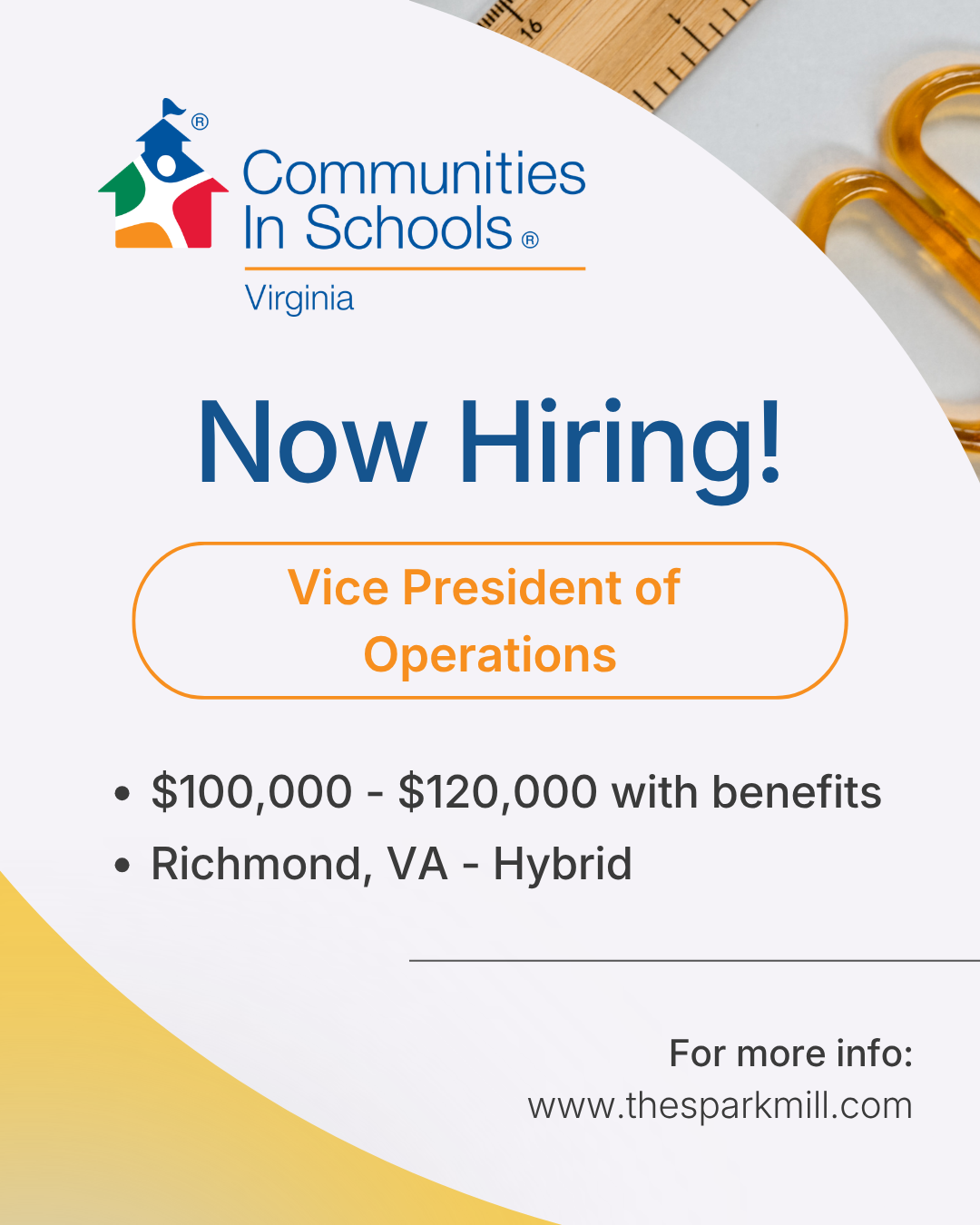 This is a full-time, salaried position based in Richmond, VA. The position reports to Communities in Schools of Virginia’s CEO and leads the Operations team, which will include the Administrative Coordinator and will work closely with the Grants Manager. CIS-VA provides a hybrid work schedule with Mondays and Fridays at home and Tuesdays through Thursdays in office. Travel is as needed.