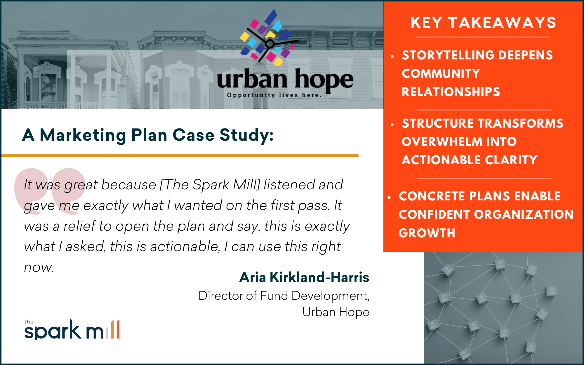 At the end of 2025, The Spark Mill partnered with Urban Hope, a 25-year-old affordable housing nonprofit serving its East End community through three core pillars: safe, affordable housing, financial health, and connected community. As the organization approached a significant growth trajectory, increasing its fundraising goals and expanding staff, they recognized the need for a strategic, intentional approach to marketing and communications. The Spark Mill worked closely with Urban Hope's Director of Fund Development, Aria Kirkland-Harris to develop a comprehensive marketing plan that would not only support their immediate expansion but also help them build the infrastructure needed to welcome new supporters into their mission. Last month, we reconnected with Aria to reflect on her experience and what this plan means for Urban Hope’s future.